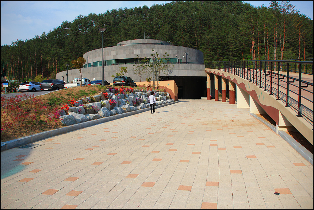 전시관 입구는 전혀 예상치 못한 곳에 숨어 있습니다. 나무의 나이테를 형상화했다고 하는데 전혀 그렇게 안 보이는군요. 일정 높이마다 소나무 테를 둘렀으면 좀 더 그럴듯해 보일텐데...