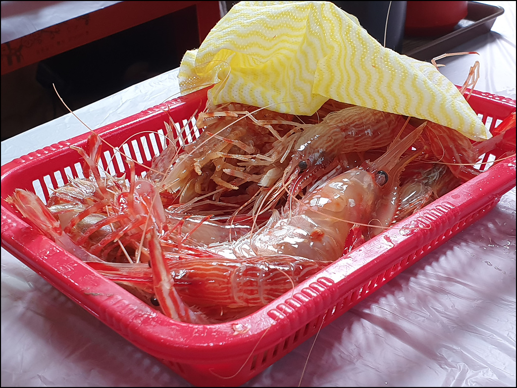 살아 뛰는 꽃새우와 닭새우... 우리 부부는 입맛이 까다로워 외식을 거의 안 하니 엥겔지수가 매우 낮아 소득 최상위인데 오늘은 최하위로 떨어졌네요.