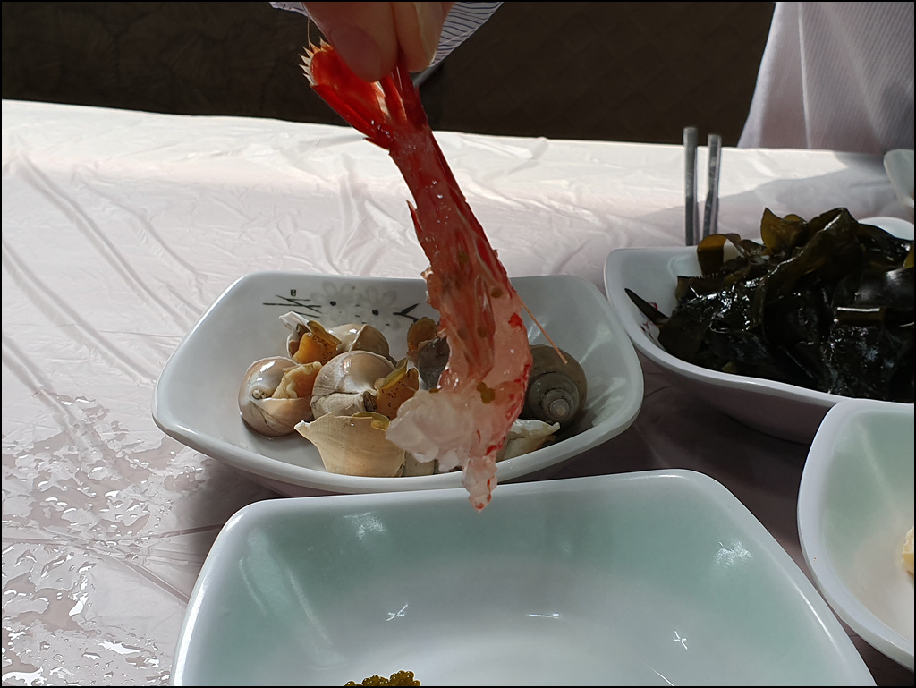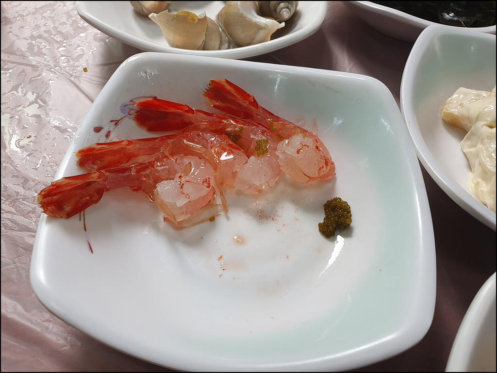 살아 뛰는 꽃새우와 닭새우... 우리 부부는 입맛이 까다로워 외식을 거의 안 하니 엥겔지수가 매우 낮아 소득 최상위인데 오늘은 최하위로 떨어졌네요.