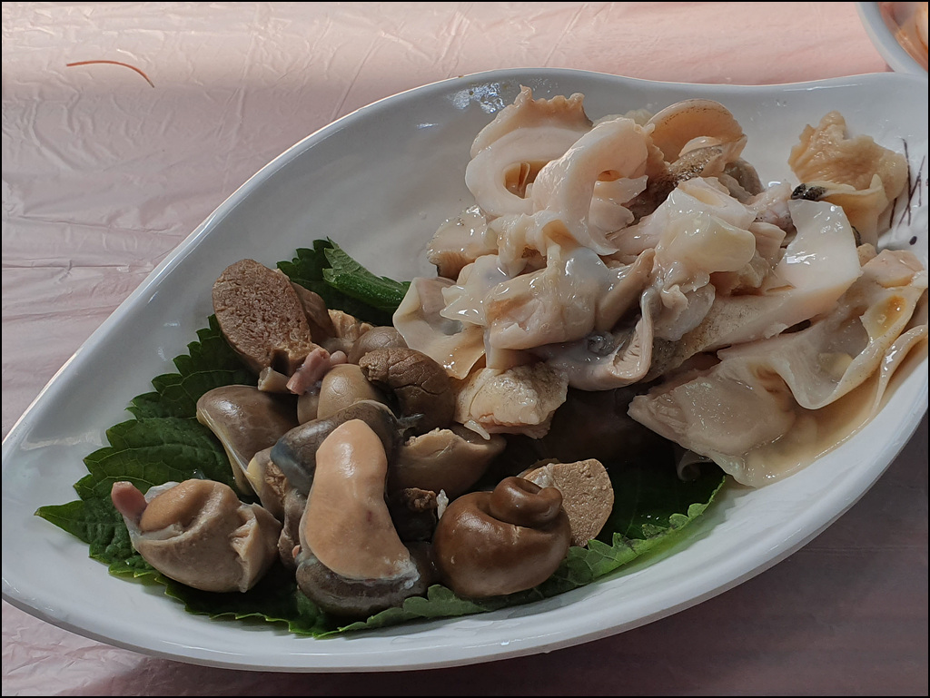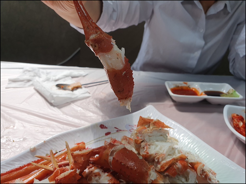 금강산도 식후경, 자주 가는 죽변항 횟집에 들렀습니다. 그동안 금징어였던 오징어가 올해는 꽤 많이 잡히는 것 같습니다. 속이 꽉 찼다는 홍게 두 마리, 참소라 조금, 닭새우와 꽃새우를 섞어 주문을 완료하고 식당을 들어서던 집사람이 다짜고짜 세 마리에 만 원이라는 오징어를 도무지 가늠할 수 없는 양인 조금만 달라고 하니 선뜻 조금만 썰어 주십니다.