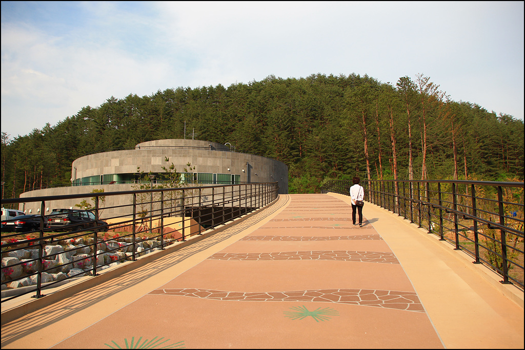 전시관 입구는 전혀 예상치 못한 곳에 숨어 있습니다. 나무의 나이테를 형상화했다고 하는데 전혀 그렇게 안 보이는군요. 일정 높이마다 소나무 테를 둘렀으면 좀 더 그럴듯해 보일텐데...