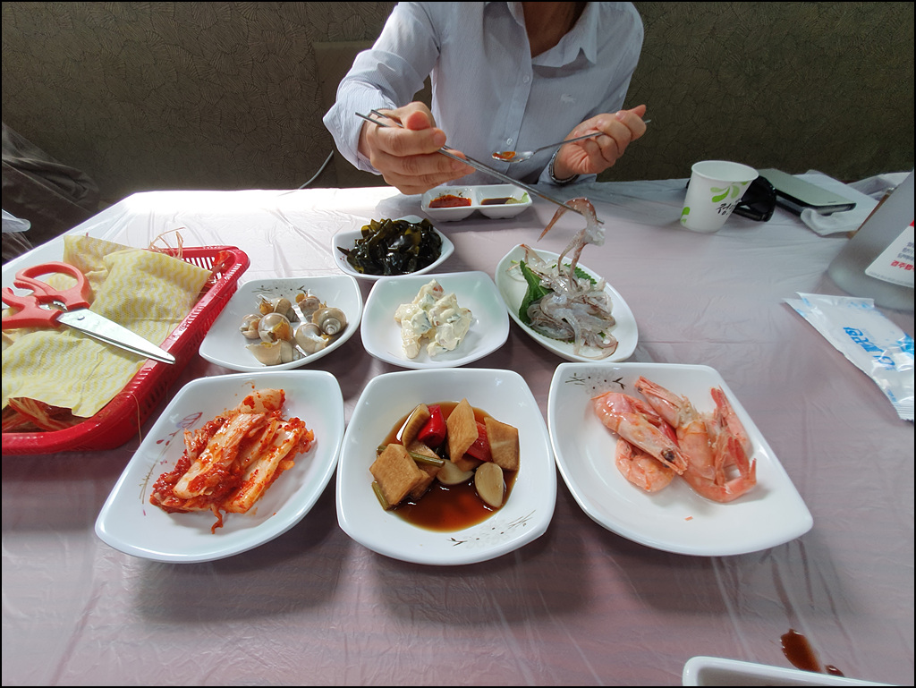 금강산도 식후경, 자주 가는 죽변항 횟집에 들렀습니다. 그동안 금징어였던 오징어가 올해는 꽤 많이 잡히는 것 같습니다. 속이 꽉 찼다는 홍게 두 마리, 참소라 조금, 닭새우와 꽃새우를 섞어 주문을 완료하고 식당을 들어서던 집사람이 다짜고짜 세 마리에 만 원이라는 오징어를 도무지 가늠할 수 없는 양인 조금만 달라고 하니 선뜻 조금만 썰어 주십니다.