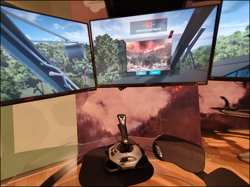 산불 진화 헬리콥터 시물레이션인데 앉기도 불편하고 고정되지 않은 조이스틱과 어떻게 조작하는지 설명조차 없네요.